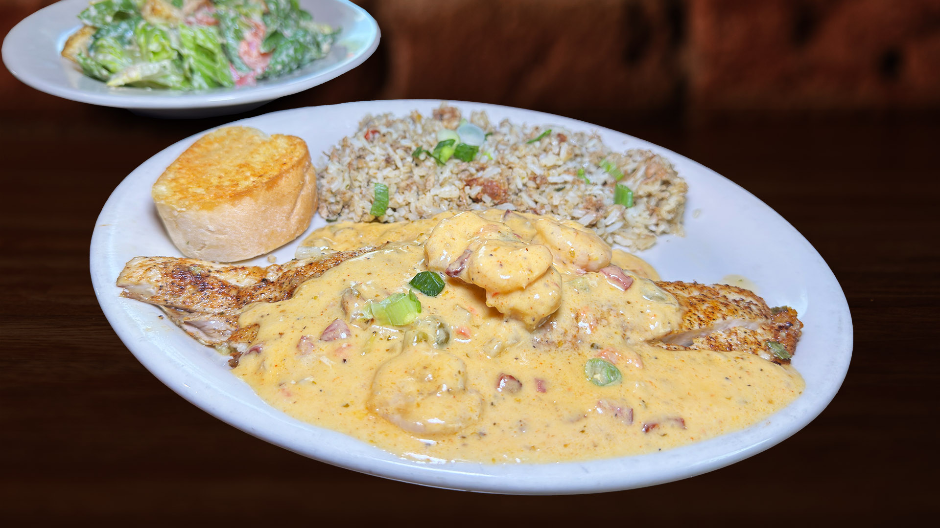 Looking for something grilled? Our Rockdale Redfish, topped with creamy andouille sauce and shrimp, is a house favorite. If you love spice, try the Blackened Redfish Étouffée, where bold Cajun seasoning meets creamy crawfish goodness. For a light, zesty option, the Grilled Salmon Creole brings smoky char and citrus-infused butter to the table.